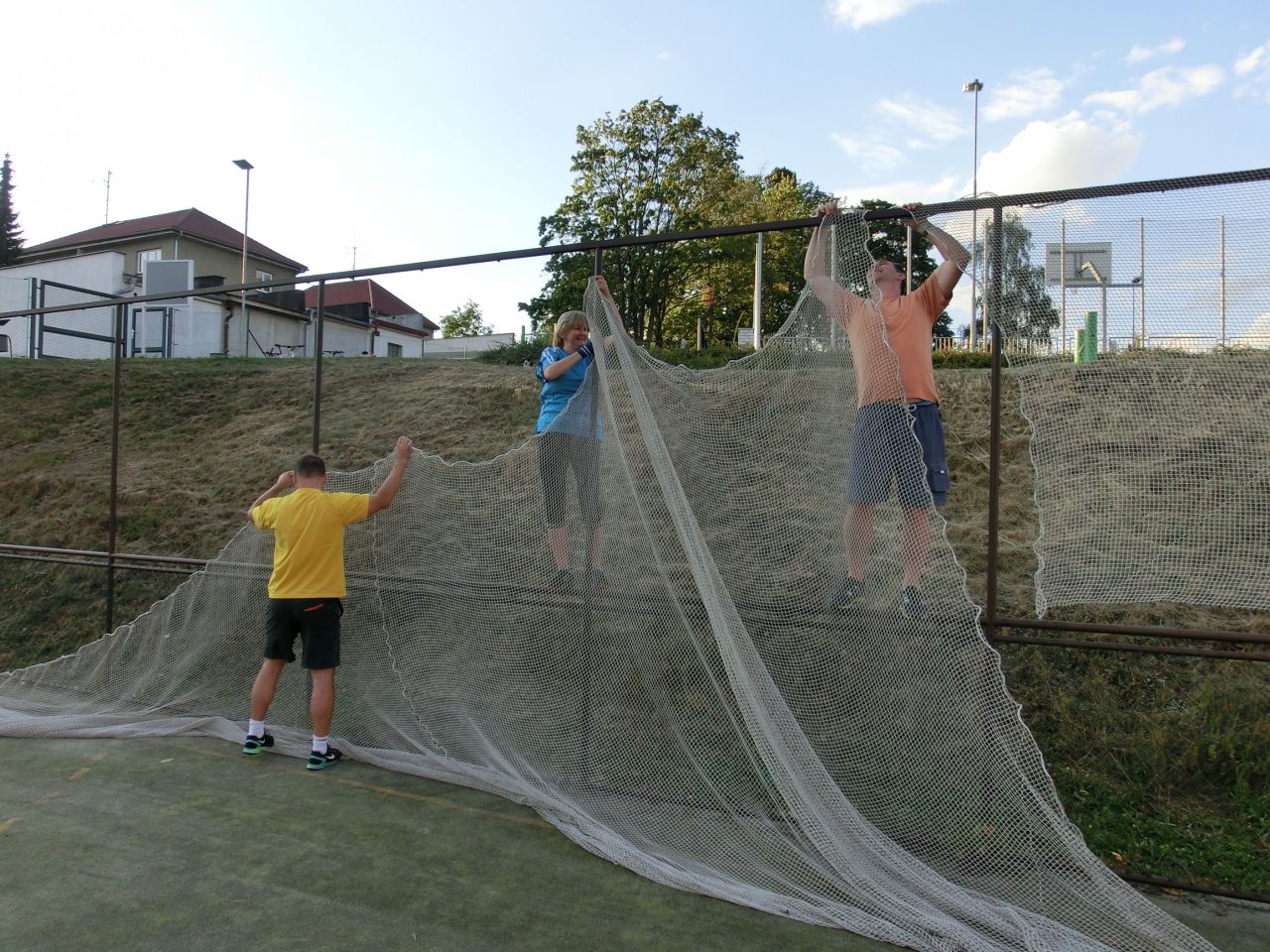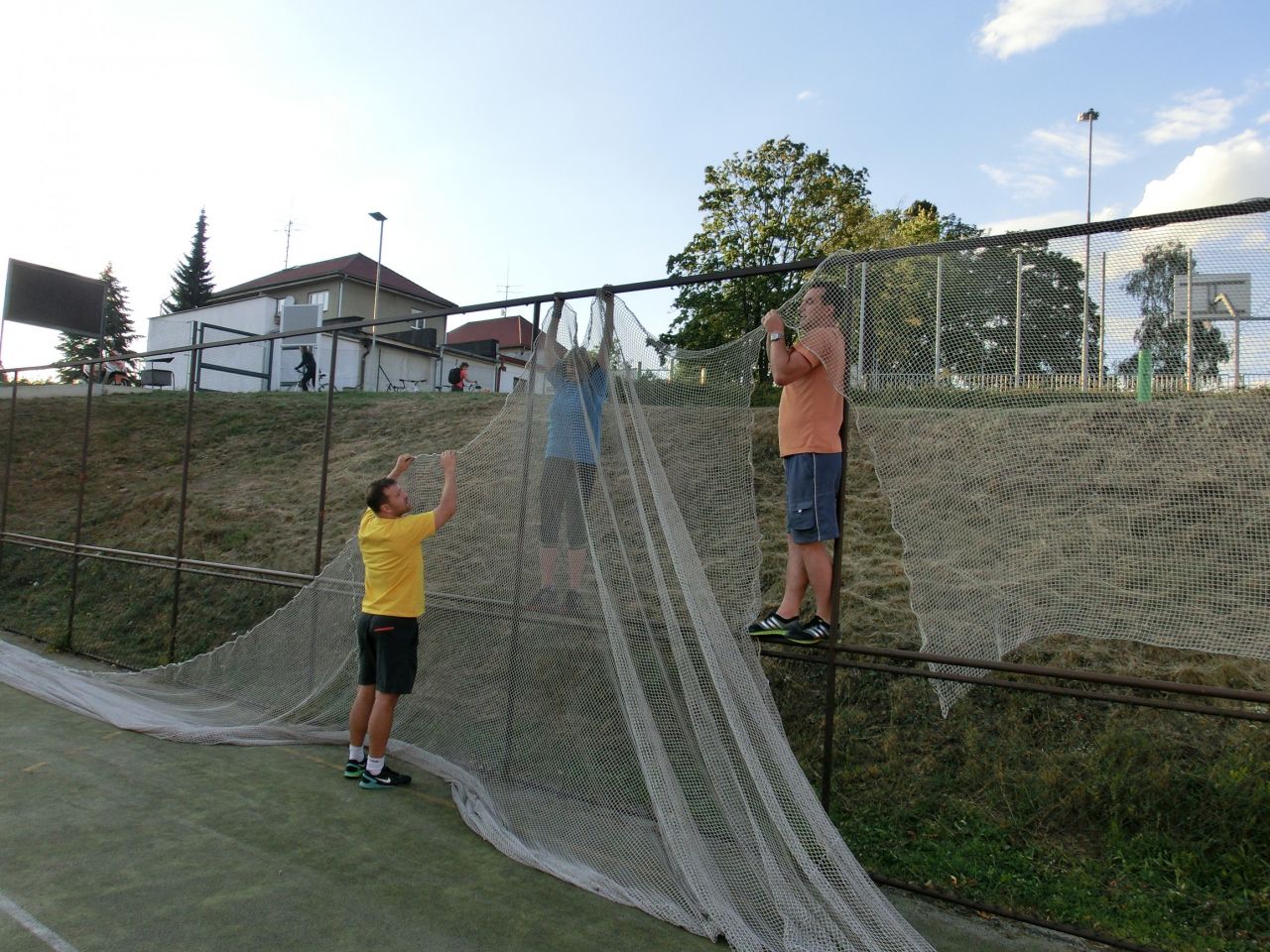 Napínání nových ochranných sítí okolo tenisového dvorce.